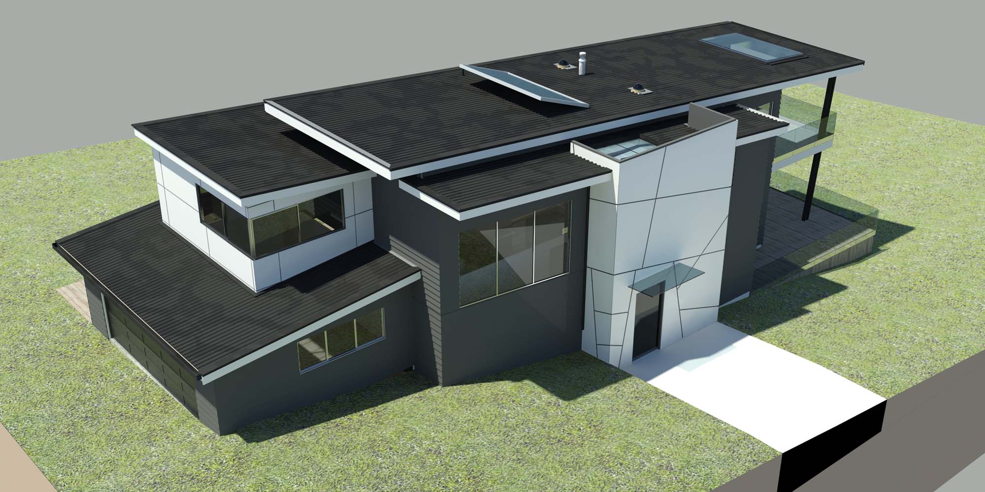 This grew from the above to a two-stage development with the initial 3-bedroom, 2-storey home turning into something much more. Stage one became a 3-storey, 3-bedroom house complete with a lift to service all floors. The house is sits well into the bank using retaining walls with the top floor adjacent to the top of Kennedy Park. The south and west elevation is dominated by a large, structural steel portal structure which allows for a 2-storey full height light and stairwell.